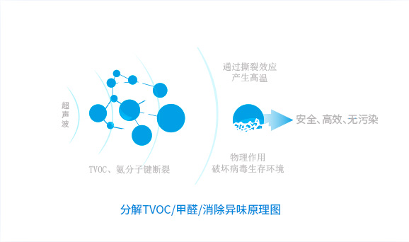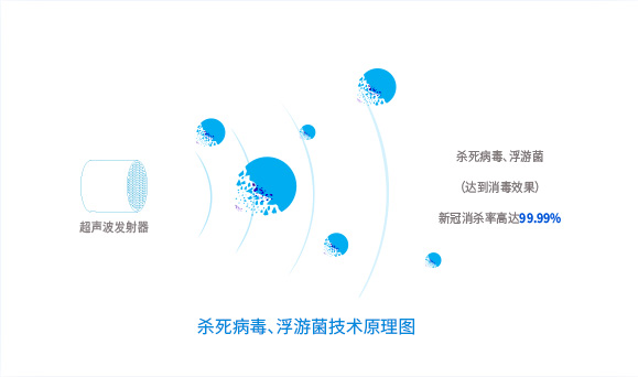 利用超聲波物理作用在空氣媒質中傳播高頻耦合性疏密媒介振動,帶動氣溶膠進行高速耦合運動。靠強烈的加速度往復運動可以對氣溶膠中的新冠病毒和耦合微生物產生撕裂效應,使微生物細胞及內容物、病毒RNA鏈受到強烈的震蕩斷裂,從而達到對微生物滅活的效應。