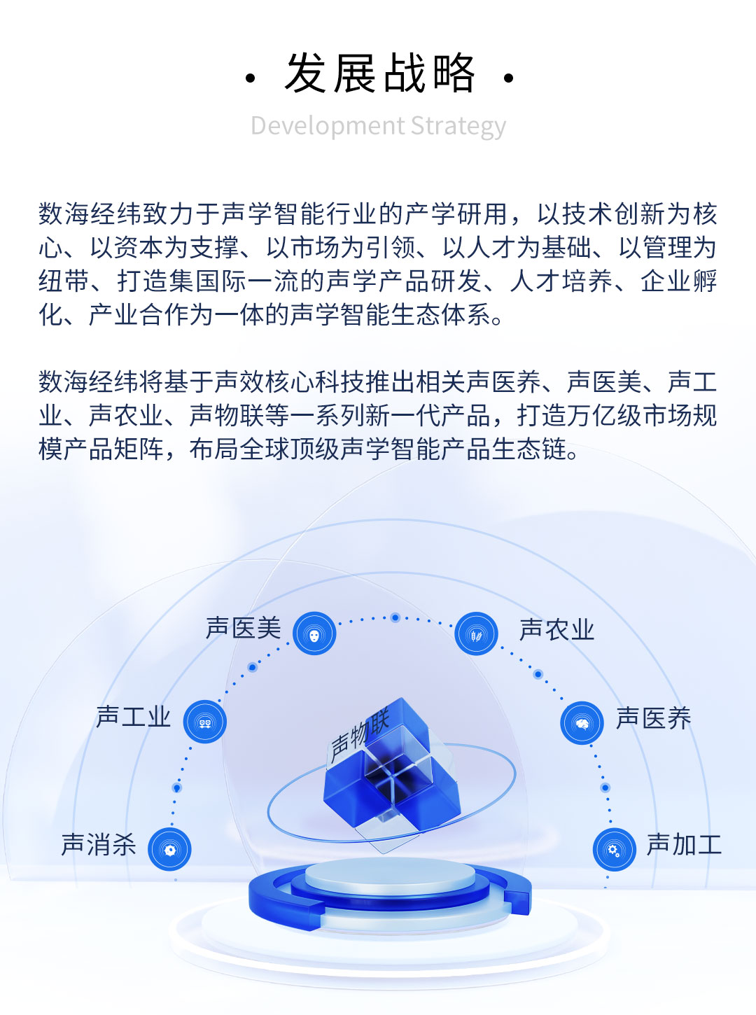 數海經緯致力于聲學智能的產、學、研、用,以技術創新為核心、以國際資本為支撐、以全球市場為引領、以人才為基礎、以管理為紐帶,打造國際一流的聲學智能產品體系。數海經緯基于聲學智能核心科技推出聲物聯、聲消殺、聲醫美、聲醫養、聲工業、聲加工、聲農業等一系列產品,打造萬億級市場規模產品矩陣,布局全球頂級聲學智能生態鏈。